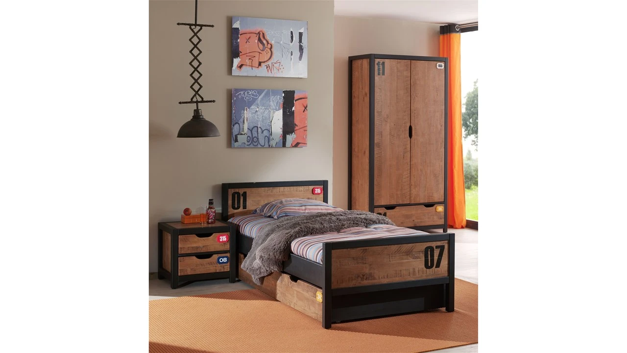 Met Complete Kinderkamer Daan met 2-deurs kast kies je voor een ruige en tegelijkertijd speelse kinderkamer. Deze 4-delige set bestaat uit Bed Daan, Nachtkast Daan, Slaaplade Daan én Draaideurkast Daan. Alle meubelen hebben een metalen basis met kwalitatieve grenenhouten platen om het zo een industriële uitstraling te geven. Deze industriële uitstraling is terug te vinden in alle meubels van de Vipack Daan Kinderkamer serie.